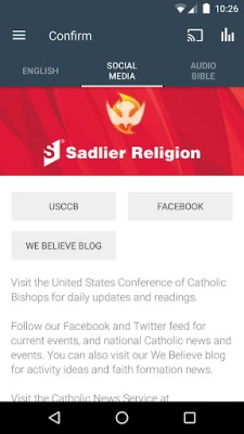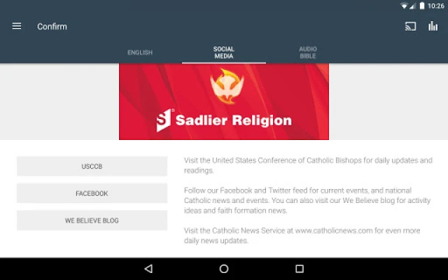 Confirmation App is a fully integrated companion to Believe – Celebrate – Live immediate preparation for the sacraments of Confirmation. This application provides engaging resources for Catechists, Parents, and Sponsors in both English and Spanish. Easy to access resources include session planners, Q&A, tips and activities, rituals and prayers, video clips, and music clips for each of the six sessions in the series.