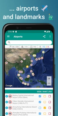Places Been allows to track cities, villages, airports, ports, UNESCO Sites, National Parks.