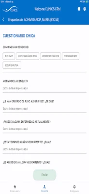 - Encuestas y cuestionarios: permite responder de forma confidencial encuestas y cuestionarios de salud, los almacena automáticamente en la historia del paciente.